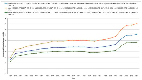 Throughout the study period, males consistently exhibited a higher AAMR. For males, their AAMR rose from 14.52 in 1999 to 22.92 in 2001, with an APC of 22.54* (13.18 to 29.25, p < 0.001). The rate continued to increase from 22.92 in 2001 to 29.5 in 2007, with an APC of 3.23* (1.56 to 6.03, p = 0.0040). From 2007 to 2018, the AAMR remained stable. However, it surged again from 32.27 in 2018 to 43.64 in 2021, showing an APC of 12.00* (8.92 to 14.06, p = 0.0024), followed by stability from 2021 to 2023.