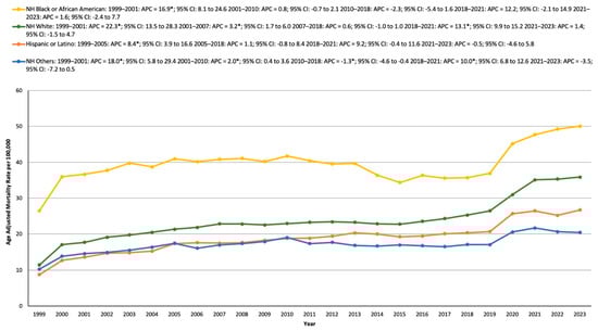 Age-adjusted mortality rates per 100,000 in the population stratified by race/ethnicity in the United States, 1999–2023, * indicates statistical significance.
