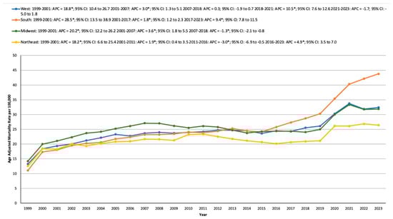 In the midwest, the AAMR grew from 14.22 in 1999 to 21.06 in 2001, with an APC of 20.15* (12.16 to 26.19; p < 0.00001). This was followed by an additional increase from 21.06 in 2001 to 27.07 in 2007 (APC: 3.59*; 1.79 to 5.46; p = 0.0028). However, the rate declined from 27.07 in 2007 to 24.03 in 2018 (APC: −1.26*; −2.07 to −0.78; p = 0.0016). It then rose sharply from 24.03 in 2018 to 33.32 in 2021, with an APC of 11.97* (8.60 to 14.04; p = 0.0020), remaining stable from 2021 to 2023.