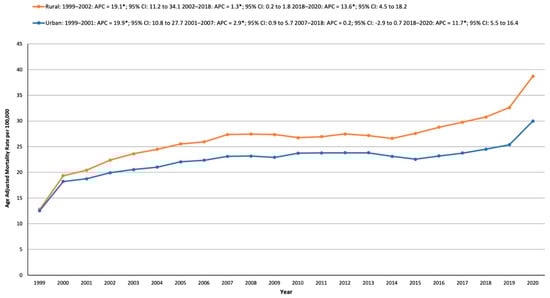 Further analysis of mortality trends was conducted by state, U.S. Census regions (Northeast, Midwest, South, and West), and levels of county urbanization. Counties were classified as rural (including micropolitan and noncore areas) or urban (large central metro, large fringe metro, medium metro, and small metro areas) based on the 2013 Urban-Rural Classification Scheme from the National Center for Health Statistics [].