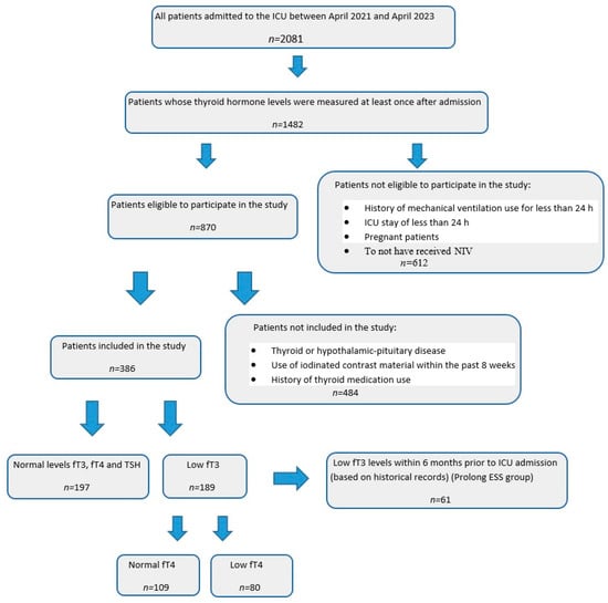 A total of 2081 patients were admitted to the ICU within the specified dates above. A flow chart of the patients included in this study is shown in Figure 1. Patients were excluded from the study if they had an ICU stay of less than 24 h; NIV usage of less than 24 h; pregnancy, thyroid, or hypothalamic-pituitary disease (disorders originating from the thyroid gland itself or the hypothalamic–pituitary axis that directly affect thyroid hormone production, such as autoimmune thyroiditis, pituitary adenomas, or hypothalamic lesions); use of iodinated contrast material within the previous 8 weeks; or a history of thyroid medication use. Additionally, to exclude primary hypothyroidism, patients with high serum TSH levels and low fT3 and fT4 levels, as well as clinically overt hypothyroid symptoms, were excluded. To exclude central (secondary) hypothyroidism, patients with low or inappropriately normal TSH levels along with low fT3 and fT4 levels were not included in the study. Additionally, patients with thyrotoxicosis (hyperthyroidism), characterized by suppressed TSH levels and elevated fT3 and fT4 levels, were also excluded from the study. After applying the exclusion criteria, 386 patients were included in the study.