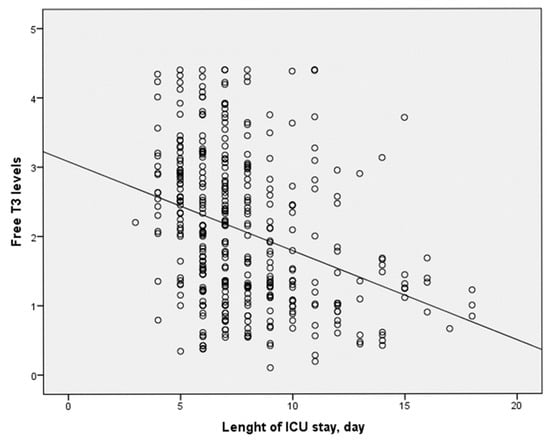 This figure shows there was a negative, moderate, and statistically significant correlation between fT3 and LOS-ICU levels (rho = −0.360 and p < 0.001).