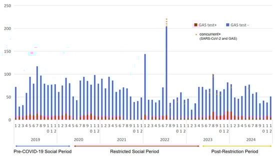 In this single-center observational study, data from patients who visited Tokyo Shinagawa Hospital (Tokyo, Japan) between 1 January 2019 and 31 December 2024 were retrospectively analyzed. Data on patient age, sex, and GAS and SARS-CoV-2 test results were retrospectively collected from medical records. GAS testing was performed by internal medicine physicians, otolaryngologists, and pediatricians in the outpatient fever clinic and emergency outpatient departments for patients clinically suspected of having pharyngitis. Oropharyngeal swabs were collected by specialized nurses. GAS antigens were detected using Capilia Strep A (TAUNS Laboratories, Inc., Izunokuni, Shizuoka, Japan), which has a sensitivity of 93.1% and a specificity of 100% [].