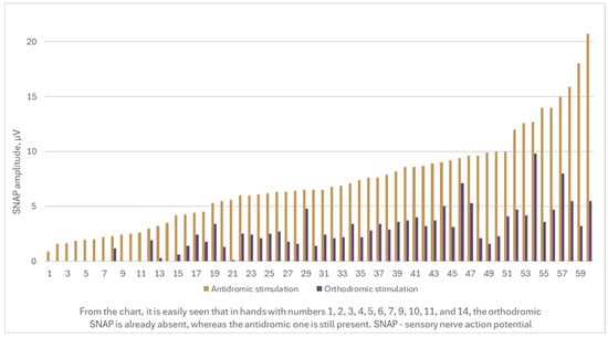 Of the total patients, 8 (13.3%) exhibited decreased amplitudes in both distal and proximal motor latencies, suggesting secondary axonal loss of motor fibers. The reference nerve, the ulnar nerve, was found to have all parameters—including SNAP and CMAP amplitudes, distal sensory and motor latencies, and sensory and motor conduction velocities—within normal ranges. The primary parameters investigated and analyzed were related to the median nerve, including DML, distal CMAP amplitude in the wrist, and all sensory fiber measurements. Importantly, orthodromic SNAP was absent in 18.3% of the examined hands, whereas the antidromic SNAP remained present (Figure 1).