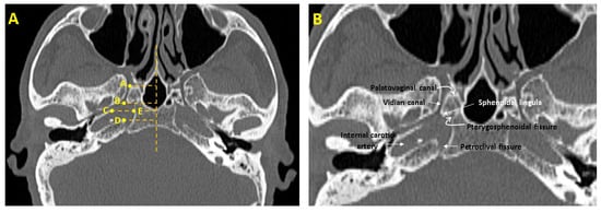Morphometric measurements were conducted using predefined anatomical reference points to ensure consistency across all subjects. These landmarks were selected based on their high reproducibility, clear visibility in axial CT images, and relevance in previously published studies on skull base anatomy (Table 1) [1,4,6,15,23,24]. For instance, the base of the sphenoidal lingula, the pterygosphenoidal fissure, and the petroclival fissure were identified by established anatomical descriptions (Figure 1) [1,4,23,24]. All measurements were performed in a standardized axial plane for each individual. For each participant, the axial section in which the vidian canal was most clearly visible was identified, and all measurements were performed on this selected plane (Figure 1). By consistently using the most optimal section for each individual, measurement accuracy and reproducibility were ensured throughout the study.