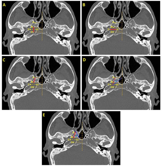 (A) Length of the foramen lacerum (indicated by the red line). (B) Width of the foramen lacerum (indicated by the red line). (C) Length of the vidian canal (indicated by the red line). (D) Angle between the vidian canal (indicated by red line) and the pterygosphenoidal fissure (indicated by blue line). (E) Angle between the vidian canal (indicated by red line) and the palatovaginal canal (indicated by blue line).