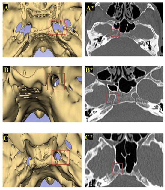 3D Slicer is a free, open-source medical image computing and visualization software application https://www.slicer.org (accessed on 1 August 2023) [19]. The 3D Slicer method used in this study has been extensively validated in previous research, confirming its accuracy, reproducibility, and effectiveness for investigations of the skull base [21,22]. Our study processed and analyzed cranial CT images using 3D Slicer version 5.3.1. Intra-rater reliability was assessed by having the same evaluator perform the measurements twice at different time points. The average of the two measurements was used for analysis.