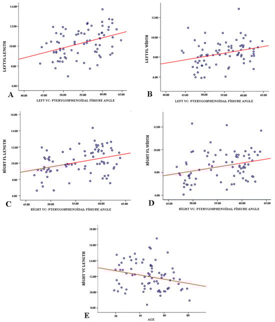 Dot plot of the correlation analysis (A) left foramen lacerum (FL) length and left VC-pterygosphenoidal fissure angle (r = 0.393, p < 0.05); (B) left FL width and left VC-pterygosphenoidal fissure angle (r = 0.294, p < 0.05); (C) right FL length and right VC-pterygosphenoidal fissure angle (r = 0.357, p < 0.05); (D) right FL width and right VC-pterygosphenoidal fissure angle (r= 0.285, p < 0.05); (E) right VC length and age (r = −0.248, p < 0.05).