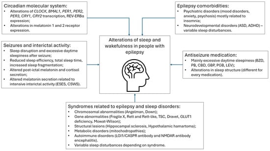 Given that epilepsy is a heterogeneous disorder, it is safe to assume that sleep–wake profiles are different in each individual with epilepsy. In this narrative review, we explore the factors that might influence sleep and wakefulness in people with epilepsy. In particular, we present an overview of the current evidence regarding molecular circadian system alterations in the context of seizures, the influence of seizures and interictal activity on sleep and circadian rhythms, and the influence of various syndromes, comorbidities, and antiseizure medications on sleep and wakefulness (Figure 1).
