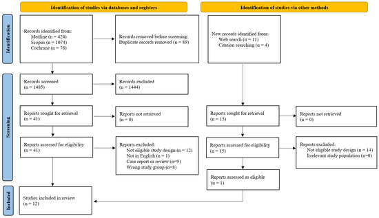 A comprehensive literature search was conducted on 25 March 2025, across three electronic databases: Medline (n = 424), Scopus (n = 1074), and Cochrane (n = 76), yielding a total of 1574 records. An additional 15 records were identified through web searches (n = 11) and citation tracking (n = 4). After removing 89 duplicates, 1485 unique records were screened. Of these, 1444 were excluded based on title and abstract. Full-text screening was performed for 56 articles in total, and 44 were excluded due to ineligible study design or wrong study group (n = 34), non-English language (n = 1), or being case reports/reviews (n = 9). Five studies that appeared to meet the inclusion criteria were excluded from the analysis for the following reasons: three did not define the outcome of clinical pregnancy [21,22,23], and two defined pregnancy solely based on a positive pregnancy test [15,24], which does not align with our stricter definition (Supplementary Table S1). This resulted in 12 studies being included in the final meta-analysis (Figure 1).