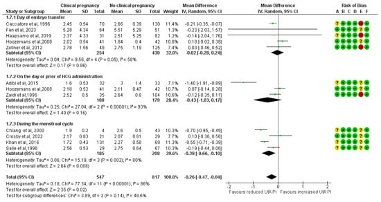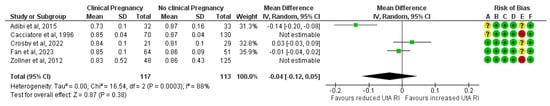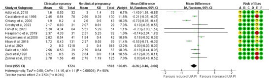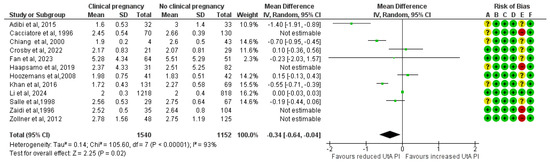 The results remained consistent after excluding the four studies classified as high risk of bias. A total of 1540 clinical pregnancies and 1152 non-clinical pregnancies were analyzed, revealing a significant reduction in the mean UtA PI in the clinical pregnancy group (MD, −0.34; 95% CI, −0.64 to −0.04; I2 = 93%) (Figure 3).
