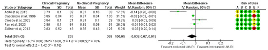 Five studies assessed UtA RI among ART pregnancies that achieved a clinical pregnancy (n = 235) and those that did not (n = 368). The forest plot suggests that the mean UtA RI does not statistically significantly differ between the study and the control group (MD, −0.03; 95% CI, −0.07 to 0.01; I2 = 76%) (Figure 4).