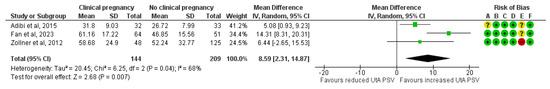 Three studies assessed the PSV before implantation in ART pregnancies that resulted in a clinical pregnancy (n = 144) compared to those that did not (n = 209). The forest plot indicates that the mean PSV was 8.6 units higher in the clinical pregnancy group, a difference that was statistically significant (MD, 8.59; 95% CI, 2.31 to 14.87; I2 = 68%) (Figure 6).