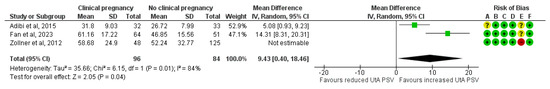 The results remained consistent after excluding the one study classified as high risk of bias. A total of 96 clinical pregnancies and 84 non-clinical pregnancies were analyzed, revealing a significant increase in the mean UtA PSV in the clinical pregnancy group (MD, 9.43; 95% CI, 0.40 to 18.46; I2 = 84%) (Figure 7).