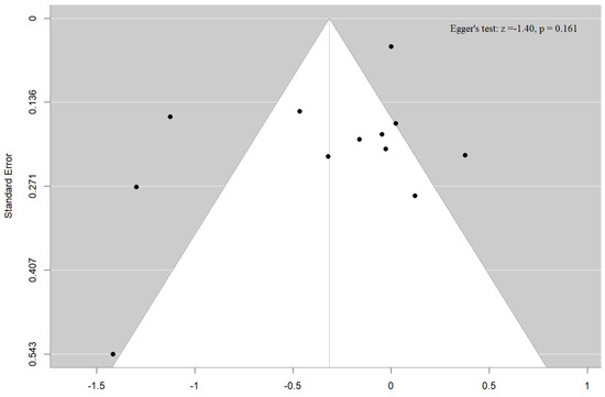 Funnel plot and Egger’s test for the association of uterine artery pulsatility index with clinical pregnancy.
