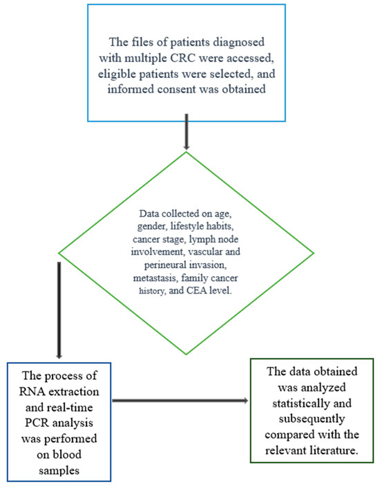 This study included patients diagnosed with CRC who had not received chemotherapy or radiotherapy prior to blood sampling. The inclusion criteria were as follows: (1) histopathologically confirmed CRC diagnosis, (2) availability of sufficient peripheral blood samples for molecular analysis, and (3) no history of other malignancies or chronic inflammatory diseases (Figure 1).