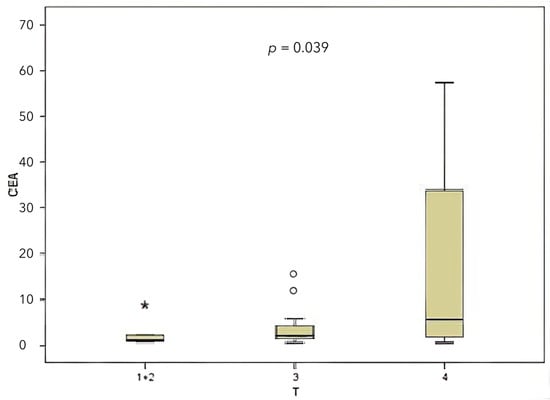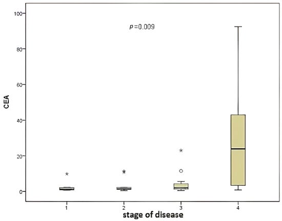 A significant correlation was identified between disease stage and CEA level (Figure 2) when the two variables were compared (p = 0.009).