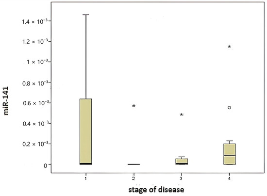 A comparison of miR-141 levels according to disease stage (Figure 3) revealed no statistically significant differences (p = 0.219).