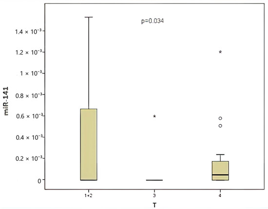 When classified according to the local tumor invasion level (T), 20% of the patients were T1 and T2, 30% were T3, and 50% were T4. A comparison was made between CEA and miR-141 levels according to the local tumor invasion level (T). A significant correlation was identified between local tumor invasion level and CEA level (Figure 4), contingent upon the local tumor invasion level (p = 0.039). The miR-141 level was compared according to the local tumor invasion level (Figure 5). A significant correlation was found between local tumor invasion level and miR-141 (p = 0.034).