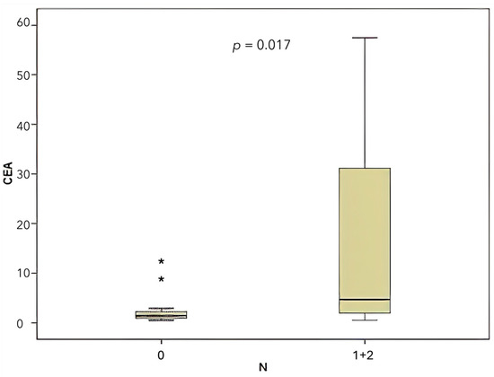 Comparison of CEA levels according to lymph node involvement (N).