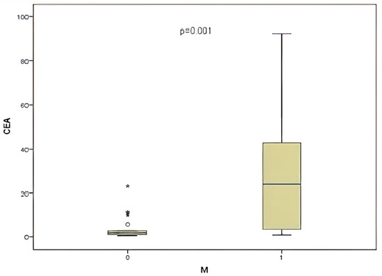 Comparison of CEA level and presence of metastasis (M).
