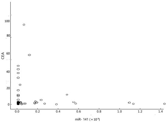 The correlation coefficient of the relationship between CEA and miR-141 was obtained, yielding a value of R equal to −0.05 (p = 0.71) (Figure 8).