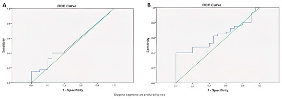 The area under the curve was calculated for miR-141, yielding an AUC = 0.54 (p = 0.65) as a result of ROC Curve Analysis. When 0.000029 was designated as the threshold value for miR-141, the sensitivity and selectivity of miR-141 above 0.000029 were found to be 40% and 75%, respectively (Figure 9A).