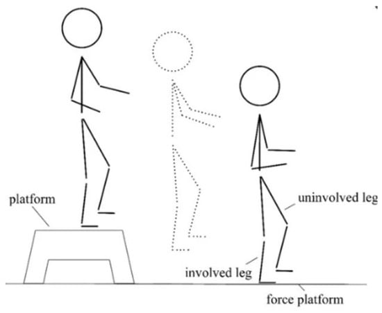- Unilateral Drop Jump (Figure 1) [17] in which the subject stands on a 30 cm high platform. At the therapist’s start, the subject had to drop, with one limb, onto the force platform in front of the step, stabilize, and remain there until the therapist’s stop warning. This test assesses the strength of the lower limbs (performed first with the healthy limb and then with the limb undergoing surgery).