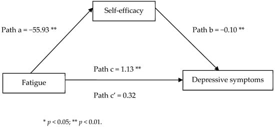 All statistical analyses in this study were conducted using SPSS 22.0 (Chicago, IL, USA) and the SPSS PROCESS macro (Version 4.2). First, participants’ personal characteristics and measures of fatigue, self-efficacy, and depressive symptoms are reported with descriptive statistics (relevant data were expressed as frequency [percentage] for ordinal and categorical data, or as means and standard deviations [SD] for continuous data). Pearson’s correlations were applied to analyze the correlations between fatigue, self-efficacy, and depressive symptoms. The mediating effect of self-efficacy between fatigue and depression was examined using the PROCESS macro Version 4.2 for SPSS []. The outputs of the PROCESS macro were organized as follows: (1) self-reported fatigue could significantly predict depressive symptoms in a regression equation (estimation and test path c); (2) self-reported fatigue significantly associated with self-efficacy in a regression equation (estimation and test path a); (3) self-efficacy attitude notably predicted depressive symptoms in the regression equation (estimation and test path b); and (4) indirect effect of self-efficacy on fatigue and depression (X through M to Y, path a*b). One null hypothesis was then set in which it represented the mediator of interest exited once the indirect effect of a*b did not equal zero. The coefficient c′ indicates the direct effect of fatigue on depressive symptoms after controlling self-efficacy influence on depressive symptoms. All of the aforesaid indicators, including estimates of a, b, c, and c′, were used to establish the schematic figure. At the same time, intermediation hypotheses were tested with the bias-corrected bootstrap method with 5000 samples to calculate confidence intervals (95% CIs). An indirect effect was considered to be significant when the 95% CIs range does not span zero [].