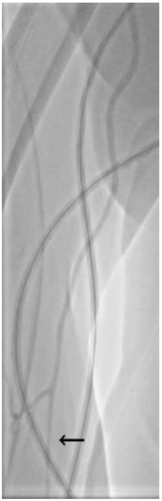 Angiogram of a radial artery that shows more than 50% diameter stenosis in the proximal part (highlighted by black arrow), consistent with RAS.