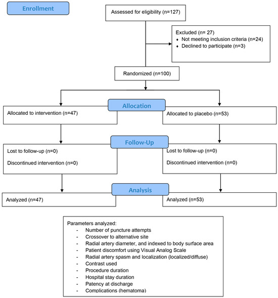 During the period of April 2023–June 2023, 100 consecutive patients who underwent invasive angiography using the radial artery approach (deemed a suitable access site by operating physician) were enrolled and randomized to either pretreatment with a topical cream 0.4% NTG, or application of a gel that contained no active substances. Sample size calculation was performed using MedCalc Statistical Software (version 22; MedCalc Software Ltd., Ostend, Belgium). Assuming a type I error (α) of 0.05 and a type II error (β) of 0.20 (80% power), we estimated proportions of 40% in group 1 and 70% in group 2, with an expected group size ratio of 1:1. This calculation indicated that 84 participants (42 in group 1 and 42 in group 2) would be required to detect a statistically significant difference between groups using a Chi-squared test. Randomization was done using a computer program designed to randomly produce either the digit 1 or 0, with 1 meaning the patient was assigned to nitroglycerine cohort and 0 to placebo cohort. The assigned nurse that handled the randomization also administered the patient’s treatment. The NTG or placebo cream was applied 20–40 min before radial artery puncture by the assigned nurse. Both creams were similar in appearance. The study was designed as a randomized, double-blinded single-center study, with neither the patient nor the operator aware of the treatment allocation.
