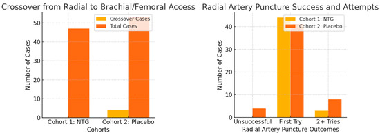 Radial artery puncture success was increased by topical NTG (p = 0.04), and crossover rates were also lower in this group (p = 0.05).