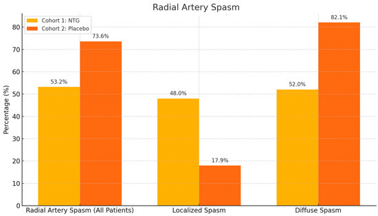 RAS incidence was lower in NTG patients than in the placebo group (p = 0.02 for spasm occurrence), and when spasm did occur, it was more frequently localized and not diffuse (p = 0.01 for difference in localized/diffuse spasm).