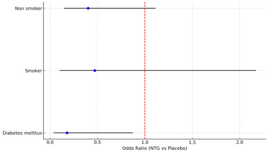 Among diabetic patients, spasm incidence was notably reduced with NTG (4/11—36.4% vs. 16/21—76.2% in the placebo group, p = 0.02). While no difference in RAS was observed in smokers, a trend towards less RAS was evident in non-smokers (Figure 5).
