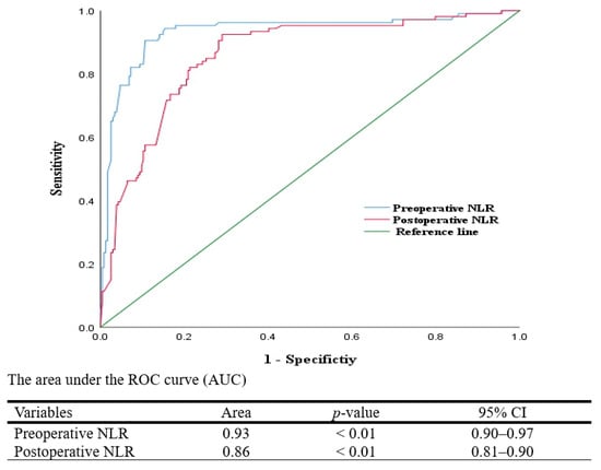 ROC analysis showed the preoperative NLR (AUC = 0.93, 95% CI: 0.90–0.96) and the postoperative NLR (AUC = 0.86, 95% CI: 0.82–0.90) as strong predictors of POD. The cut-offs were ≥4.2 (sensitivity: 85%; specificity: 90%) for the preoperative NLR and ≥6.9 (sensitivity: 80%; specificity: 85%) for the postoperative NLR (Figure 1).
