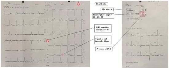 A 12-lead electrocardiogram (ECG) was performed in accordance with standard ECG acquisition rules and following American Heart Association guidelines. The ECGs were evaluated by two independent cardiologists who were unaware of the clinical data. The ERS was calculated using the scores from each ECG. The inter-rater reliability was assessed using Cohen’s kappa coefficient (κ = 0.85), which indicated excellent agreement between the cardiologists. The electrical risk score was then calculated from the ECG (Figure 1). Heart rate, signs of LVH, Tp-e interval, QTc interval, frontal QRS-T angle, and QRS transition zone were used to calculate the ERS. Patients with a heart rate higher than 75/min, presence of LVH according to Skolow–Lyon, QRS transition zone ≥ V4, QTc interval > 450 ms in men and >460 ms in women, Tp-e interval > 89 ms and frontal QRS-T angle > 90° were scored, one point for each criterion [26]. The presence of LVH was determined as the sum of the voltage of the V1S wave + V5/6R wave ≥ 35 mm based on the Sokolow–Lyon criteria [27]. QT interval was calculated from the beginning of the QRS wave to the end of the T wave and corrected using the Bazett formula (QTc Bazett: QT/√RR). The Tp-e interval was calculated as the distance between the peak and the end of the T wave. The QRS transition zone V1-6 precordial leads were analyzed, and the lead in which the R wave was greater than the S wave was identified and recorded [28]. The frontal QRS-T angle was measured as the absolute difference between the QRS axis and the T axis. In instances where this discrepancy exceeded 180°, the angle was calculated by subtracting 360° [29]. As illustrated in Figure 1, an example of ECG interpretation is presented. Scoring was conducted for each parameter. Each parameter was assigned a score, and the total score was determined as ERS (lowest score: 0, highest score: 6) [30].