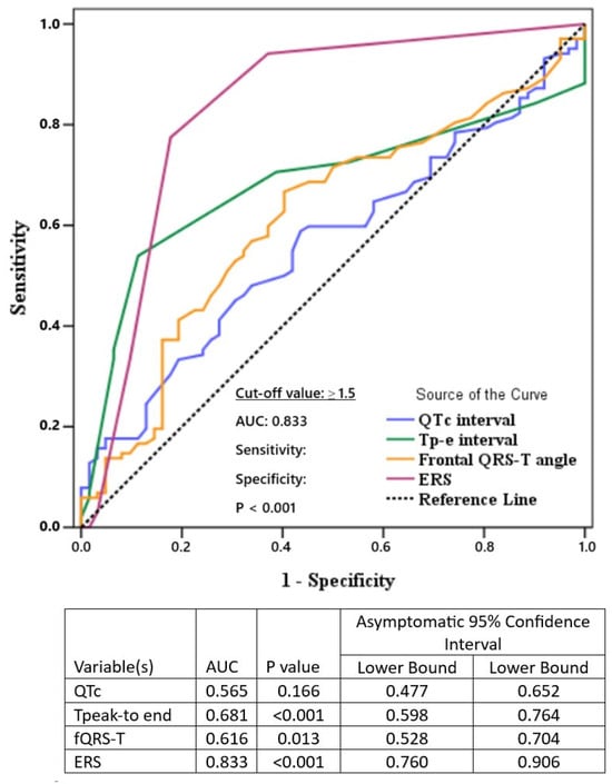 The RoC analysis was performed to compare Qtc, Tp-e, fQRS-T angle, and ERS. Our findings suggest that ERS is a superior indicator of mortality and morbidity in depression cases when compared to other ECG parameters. A review of studies conducted on patients diagnosed with major depression reveals significant variations in fQRS-T angle, Tp-e interval, and Qtc interval [14,22]. However, in the present study, all of these parameters were evaluated cumulatively, and ERS emerged as a superior indicator in the ROC analysis. With this finding, our study reveals a significant difference from other studies.
