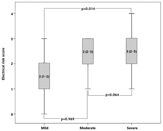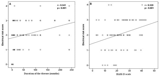 In the patients’ group, the median duration of the disease was 36 (12–120) months, and the HAM-D was 23 (17–30). Our patient group was divided into three groups according to the HAM-D scale as follows: mild (score between 8 and 15), moderate (score between 16 and 28), and severe (score ≥ 29). It was observed that ERS was significantly different among the three groups (p = 0.012). In subgroup analyses, we found that patients with severe HAM-D scores had significantly higher ERSs compared to patients with mild HAM-D scores (Figure 3). In addition, correlation analysis demonstrated that ERS was positively correlated with duration of the disease (r = 0.341, p < 0.001) and HAM-D scale (r = 0.320, p = 0.001) (Figure 4).