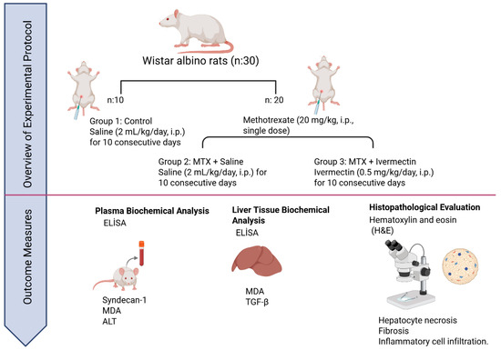 Schematic representation of the experimental protocol and outcome assessments: Thirty male Wistar albino rats were randomly divided into three groups (n = 10 per group). Group 1 (control) received 0.9% saline (2 mL/kg/day, intraperitoneally [i.p.]) for 10 consecutive days. Group 2 received a single dose of methotrexate (MTX, 20 mg/kg, i.p.), followed by saline (2 mL/kg/day, i.p.) for 10 days. Group 3 received MTX as in Group 2, followed by ivermectin (0.5 mg/kg/day, i.p.) for 10 days. Blood and liver tissue samples were collected for biochemical analyses, including plasma syndecan-1 (SDC1), malondialdehyde (MDA), and alanine aminotransferase (ALT), as well as hepatic MDA and transforming growth factor-beta (TGF-β) levels, using ELISA. Histopathological evaluation of liver sections was performed with hematoxylin and eosin (H&E) staining to assess hepatocyte necrosis, fibrosis, and inflammatory cell infiltration.