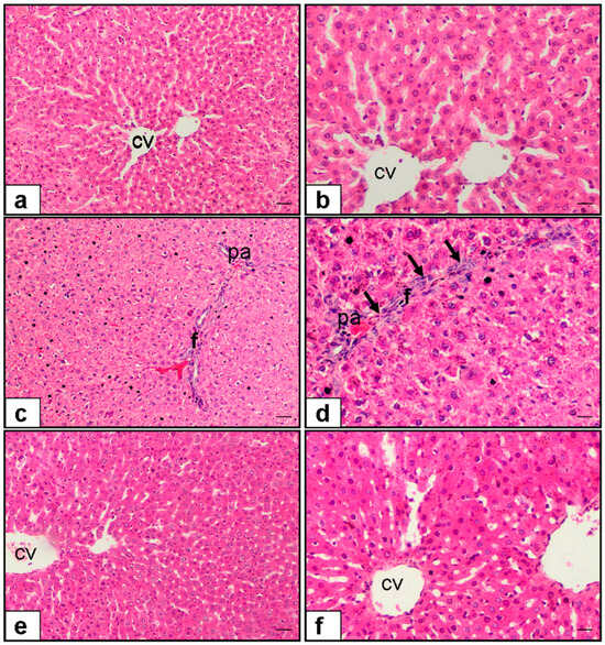 Representative histopathological images of liver tissue stained with hematoxylin and eosin (H&E) at 10× and 20× magnifications: (a,b) Control group: normal hepatic architecture with clearly visible central vein (CV). (c,d) Methotrexate (MTX) + saline group: marked bridging necrosis, portal fibrosis (F), and cellular infiltration (arrow) in the portal area (PA). (e,f) MTX + ivermectin group: reduced bridging necrosis, fibrosis, and inflammatory cell infiltration compared to the MTX group.