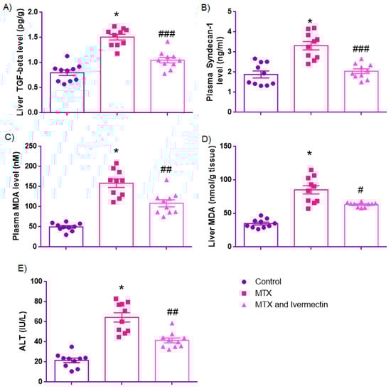 Effects of methotrexate (MTX) and ivermectin on biochemical markers of liver injury: Levels of hepatic transforming growth factor-beta (TGF-β) (A), plasma syndecan-1 (SDC1) (B), plasma malondialdehyde (MDA) (C), hepatic MDA (D), and alanine aminotransferase (ALT) (E) in the control, MTX, and MTX + ivermectin groups. MTX administration significantly increased all parameters compared to the control group (* p < 0.001, # p < 0.05, ## p < 0.01, ### p < 0.001 vs. methotrexate (MTX) group), indicating enhanced fibrogenesis, endothelial injury, oxidative stress, and hepatocellular damage. Ivermectin treatment significantly reduced these elevations, suggesting antifibrotic, antioxidant, and hepatoprotective effects.
