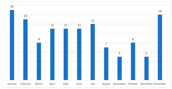 A trend of more admissions during the summer season and winter festive period was noted (Figure 1).