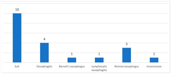 A diagnostic work-up after the removal of the food bolus is recommended to detect any underlying disease, as a lack of appropriate follow-up has been shown to be a predictor for recurrent FBO []. The most common predisposing pathology of FBO is eosinophilic oesophagitis (EoE) [,]. It is important to take an appropriate number of biopsies from several levels of the oesophagus to diagnose or exclude EoE. Several papers have suggested taking six or more biopsies from three levels of the oesophagus []. Biopsy reports are critical diagnostic criteria for EoE, specifically the number of eosinophils per high-power field (hpf). EoE is likely if the eosinophil count per hpf is above 15 hpf [].
