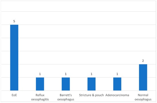 Biopsies of the upper, middle, and lower oesophagus can be performed safely with OGD or TNO, both of which are flexible scopes. In our cohort, EoE was the most common diagnosis from biopsies taken during OGD, at 48% (15/31), with adenocarcinoma at 3% (1/31). A biopsy report of a ‘normal oesophagus’ cannot be considered unless six or more biopsies from three levels of the oesophagus have been taken [].