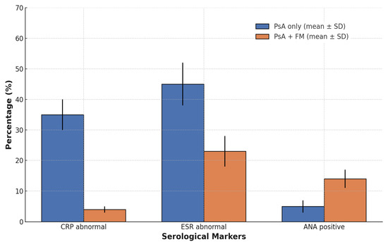 Comparison of serological marker abnormalities between patients with PsA only and those with concomitant FM. Data are presented as mean percentages ± standard deviation. Patients with both PsA and FM exhibited significantly lower rates of CRP and ESR abnormalities but higher ANA positivity, indicating a distinct serological profile. Statistically significant differences were observed for all comparisons (p < 0.001).