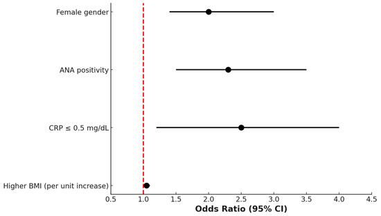 Multivariate logistic regression analysis showing factors independently associated with the coexistence of fibromyalgia (FM) in patients with psoriatic arthritis (PsA). Female gender (OR 2.2, 95% CI 1.6–3.1), antinuclear antibody (ANA) positivity (OR 1.9, 95% CI 1.3–2.8), CRP ≤ 0.5 mg/dL (OR 2.4, 95% CI 1.6–3.7), and higher BMI per unit (OR 1.05, 95% CI 1.02–1.08) were significantly associated with the PsA + FM phenotype. The dashed line represents the null value (OR = 1).