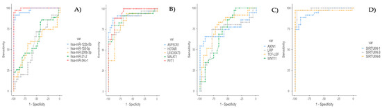 (A) ROC curve for miRNA Data. (B) ROC curve for lncRNA data (for tests with less than or equal direction). (C) ROC curve for mRNA data (for tests with less than or equal direction). (D) ROC curve for sirtuin RNA data (for tests with less than or equal direction).