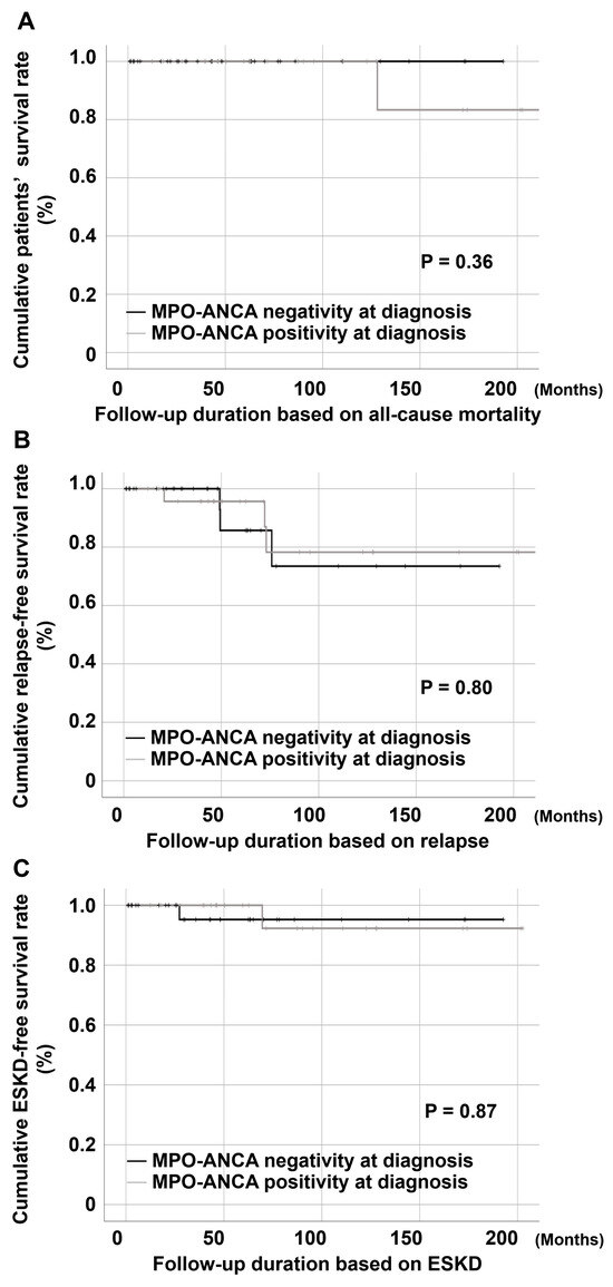 Continuous variables are reported as median (Q1–Q3 range), and categorical variables are reported as number (%). The normality of continuous variables was assessed using the Shapiro–Wilk test. For comparison between the MPO-ANCA-positive and -negative groups, the Mann–Whitney U test was used for continuous variables, while the chi-square test or Fisher’s exact test was used for categorical variables. The cumulative, relapse-free, ESKD-free, CVA-free, and ACS-free survival rates were analysed using Kaplan–Meier analysis. The log-rank test was employed to compare survival rates between the groups. A p-value of <0.05 was considered statistically significant. All analyses were conducted using SPSS software (version 28.0; IBM Corporation, Armonk, NY, USA).