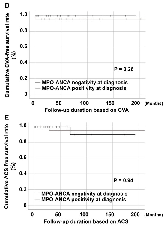 Kaplan-Meier analysis showing cumulative (A) survival rate, (B) relapse-free survival rate, (C) ESKD-free survival rate, (D) CVA-free survival rate, and (E) ACS-free survival rate according to MPO-ANCA status. ACS: acute coronary syndrome; ANCA: anti-neutrophil cytoplasmic antibody; CVA: cerebrovascular accident; ESKD: end-stage kidney disease; MPO: myeloperoxidase.