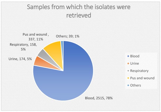 The high frequency of CoNS, especially from blood samples, may be attributed to frequent device use, suboptimal aseptic techniques, and handling by healthcare workers []. A proper interpretation of CoNS isolates is crucial, as they are often contaminants. Misidentification can lead to unnecessary treatment and resistance development [].